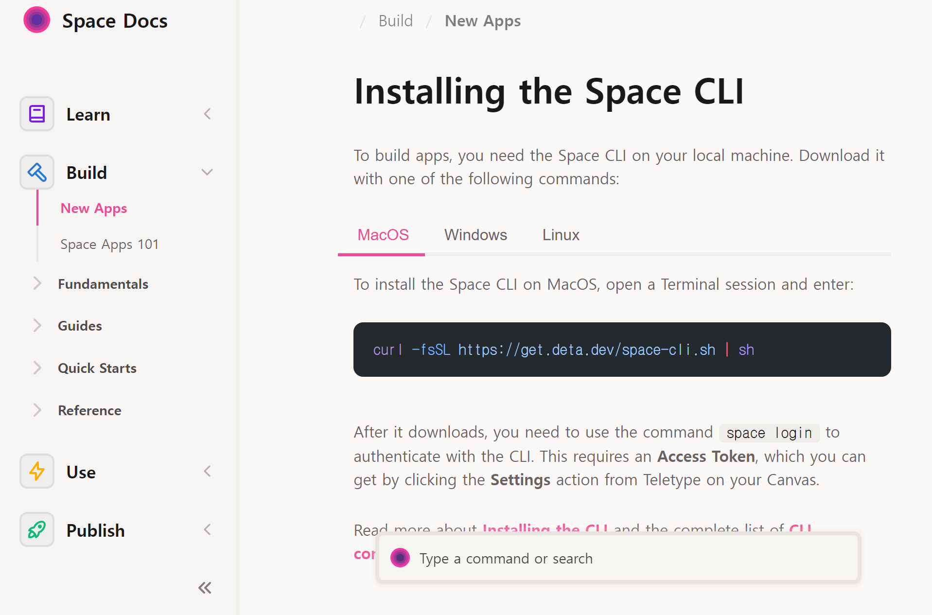 빌드 부분에 installing the Space CLI라고 보일 것이다.